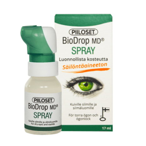 BioDrop MD® Spray lievittää kuivasilmäisyyden oireita täysin uudella tavalla. Suihkeen kostutustehon taustalla ovat tyrnin siemenöljy ja hyaluronaani, joilla kummallakin on kliinisesti tutkittuja vaikutuksia kuivasilmäisyyden oireiden hoitoon. BioDrop MD® Spray on ainutlaatuinen silmäsuihke, joka on kehitetty paitsi kuivien silmien, myös kuivien silmäluomien ja silmänympärysihon kosteutukseen. Valitse kuivien silmien hoitotuotteeksi suihke, jos perinteisten kostutustippojen laittaminen on hankalaa tai vaivalloista. Suihketta voit käyttää helposti milloin ja missä vain!